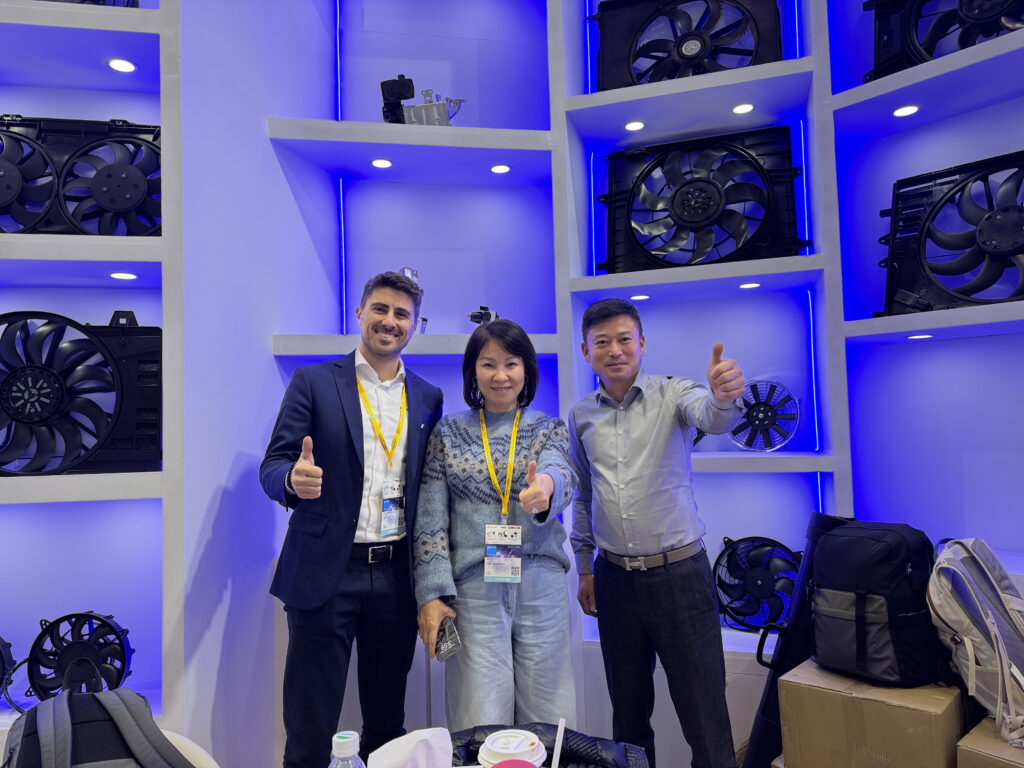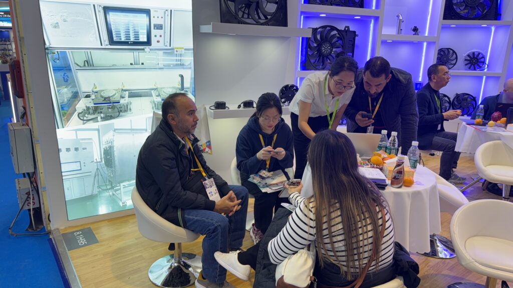 私共は、ラジェーターファン、コンデンサーファン、ファンモーター等 の製品 一 貫にわたり、深耕してまいりました。 2002年の創業以来、当社は自動車用ラジェーターファンアセンブリに特化した製造企業として、研究開 発、生産、サービスを一貫して提供しております。 自社で12,000平方メートルの生産工場を有し、8本の生産ライン、9台の射出成形機、30台のプレス機、及 び35台の各種試験 ·検査装置を備えております。ファンの年間生産能力は250万台に達します。